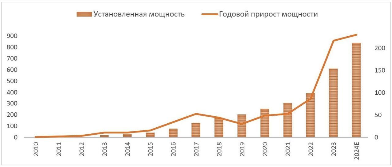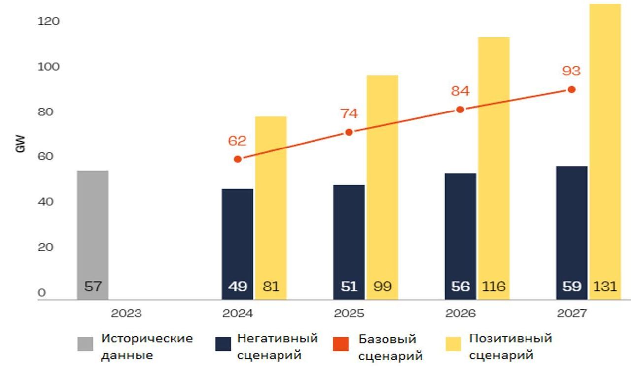 В европейских странах энергопереход вынужденно ускорился в последние годы на фоне усилий членов ЕС по отказу от российских углеводородов. Члены альянса имеют планы по достижению доли ВИЭ в энергобалансе 42–45% к 2030 году против около 25% на текущий момент. На этом фоне SolarPower Europe в своем базовом сценарии ожидает, что до 2027 года годовые темпы ввода мощностей в сфере солнечных мощностей будут увеличиваться ежегодно и в 2027-м составят 93 ГВт, это на 63% больше, чем в 2023 году. В то же время отметим, что SolarPower Europe рассматривают возможность реализации и негативного сценария, в котором ввод солнечных мощностей замедлится, однако такой сценарий предполагает макроэкономические шоки, в связи с чем считаем вероятность его реализации достаточно низкой.