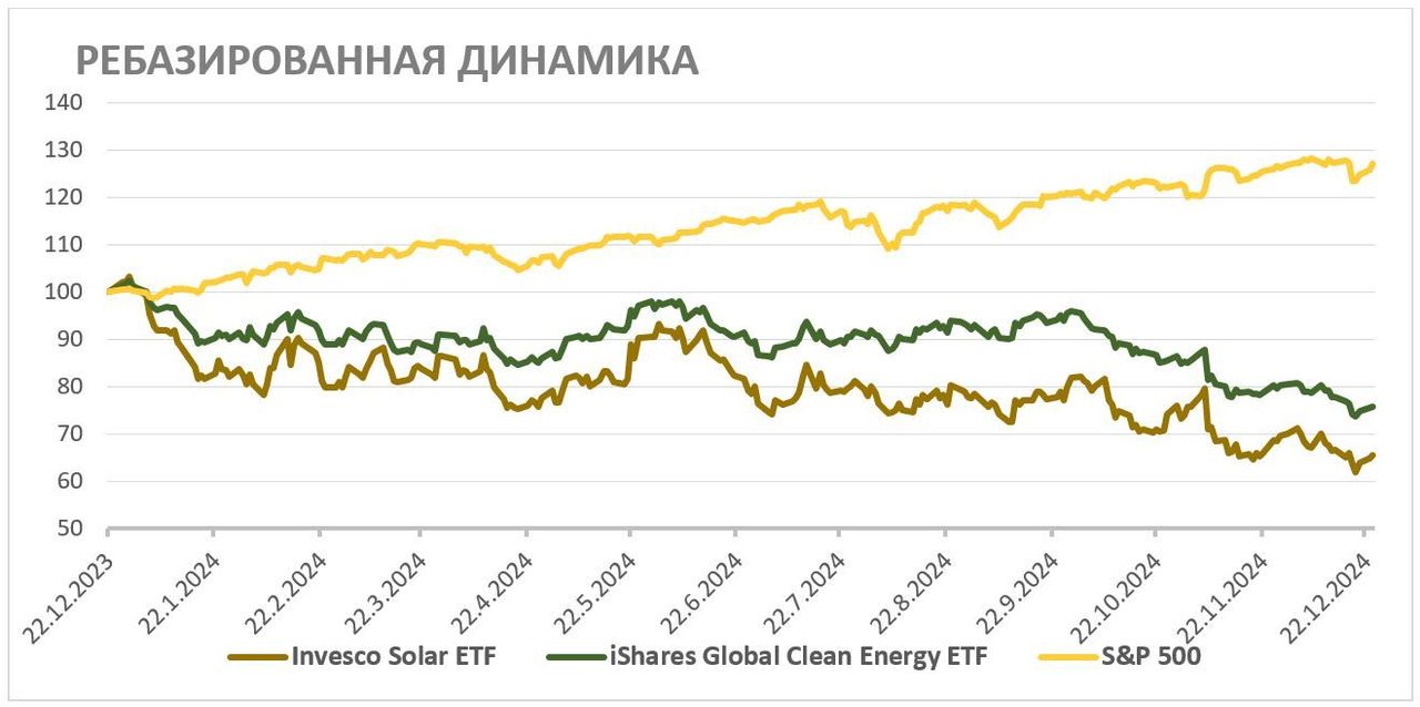 Отметим, что ключевой риск для ETF — нежелание некоторых стран активно проводить энергопереход из-за невозможности или невыгодности слишком быстрого отказа от ископаемых видов топлива. В частности, после избрания Трампа повысилась неопределенность относительно перспектив солнечной энергетики в США. Локально сектор страдает от все еще повышенных процентных ставок по всему миру. Кроме того, значимой проблемой в солнечной энергетике является снижение цен на солнечные панели и комплектующие на них.