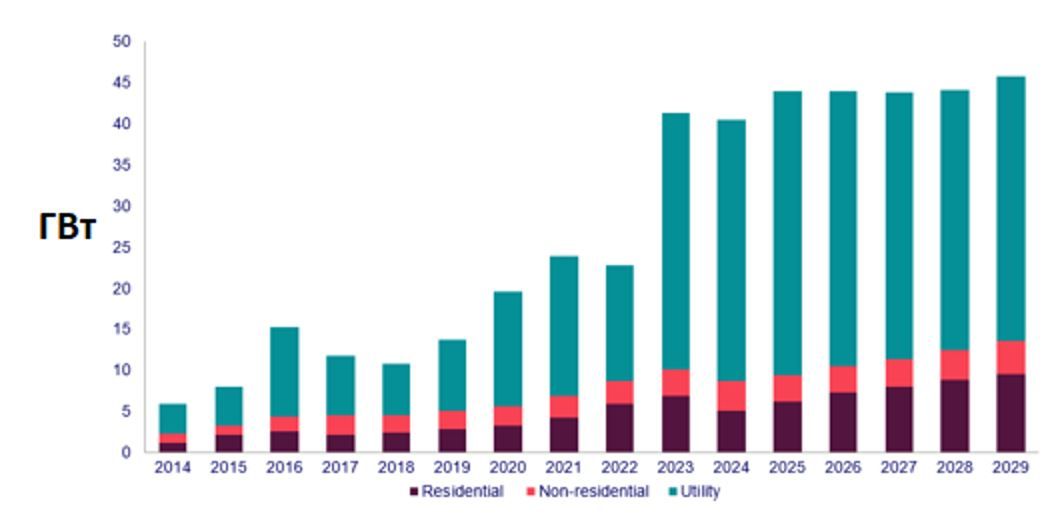 Политика новой администрации может быть достаточно непредсказуемой, нельзя исключать, что часть ранее принятых мер поддержки отрасли могут быть отменены. В то же время даже с учетом неопределенности от избрания Трампа консалтинговое агентство Wood Mackenzie ожидает, что в ближайшие годы темпы ввода новых солнечных мощностей в США будут держаться около исторического максимума, показывая небольшой рост.