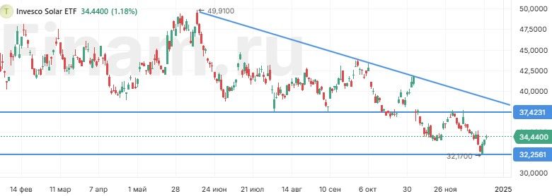 С технической точки зрения на дневном графике Invesco Solar ETF в рамках среднесрочного нисходящего тренда. Ближайшим сильным уровнем сопротивления выступает отметка $37,4, в то время как поддержкой является недавний локальный минимум на уровне $32,2.