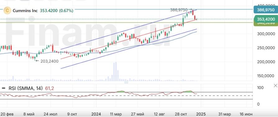 С технической точки зрения на недельном графике акции Cummins торгуются в рамках восходящего канала. В случае коррекции уровнем поддержки может стать отметка $340, после чего возможен отскок до значения 386 и выше.