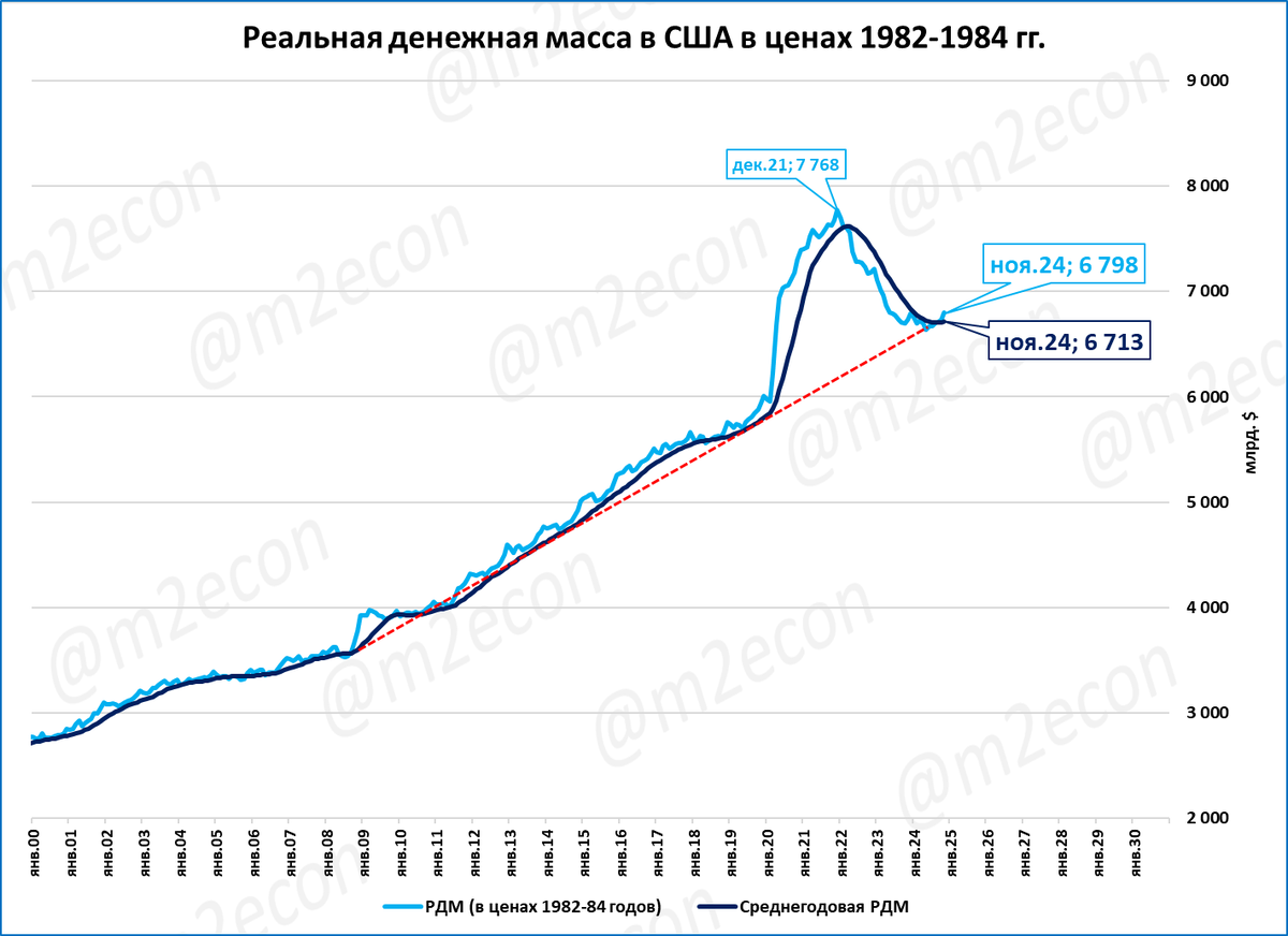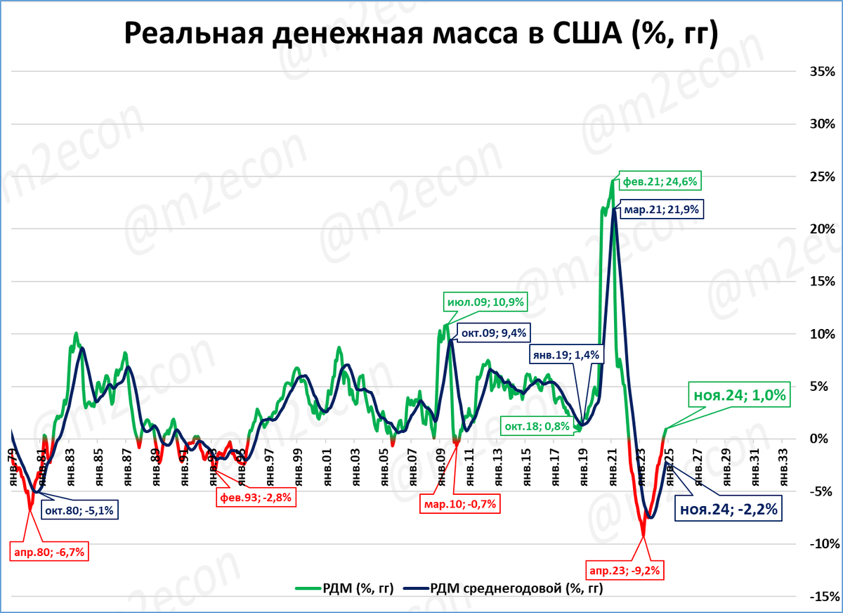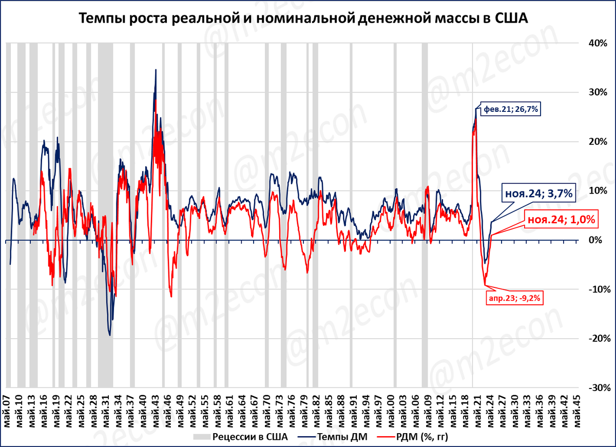 Денежная масса в США по итогам ноября выросла на 3,7%. Третий месяц она растет быстрее цен (= растёт в реальном выражении). Сжатие реальной денежной массы (РДМ), продолжавшееся 29 месяцев закончилось.