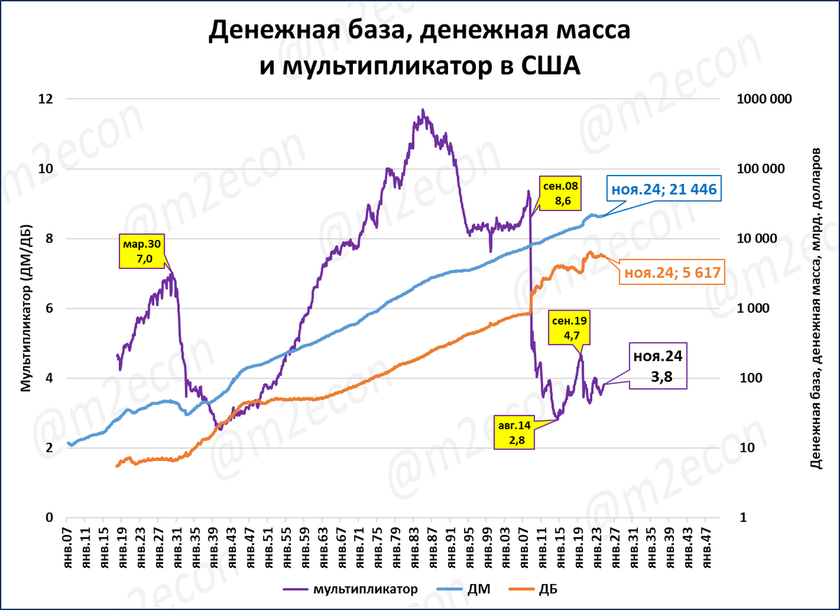 Отношение денежной массы к денежной базе в США (это и есть мультипликатор) в ходе многочисленных раундов количественного смягчения в 2008-2013 годах и ещё одного гигантского смягчения в 2020 году снизилось до 4.