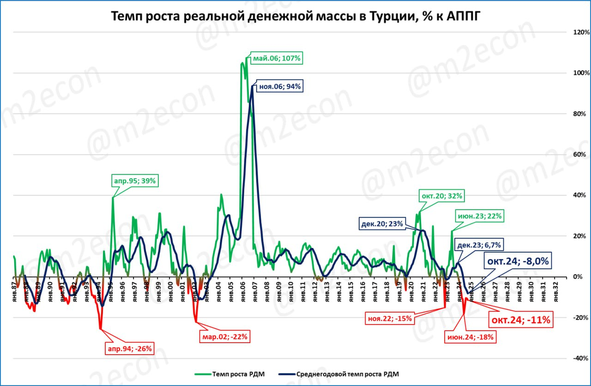 В реальном выражении денежная масса в Турции сжимается (график выше). По итогам октября она на 11% меньше, чем год назад.
