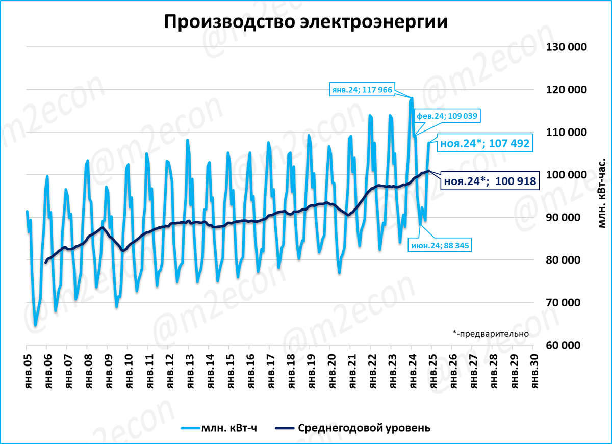 По итогам 2024 года мы увидим исторический рекорд. Впервые в истории производство электроэнергии за год превысит 1,2 трлн кВт-часов.