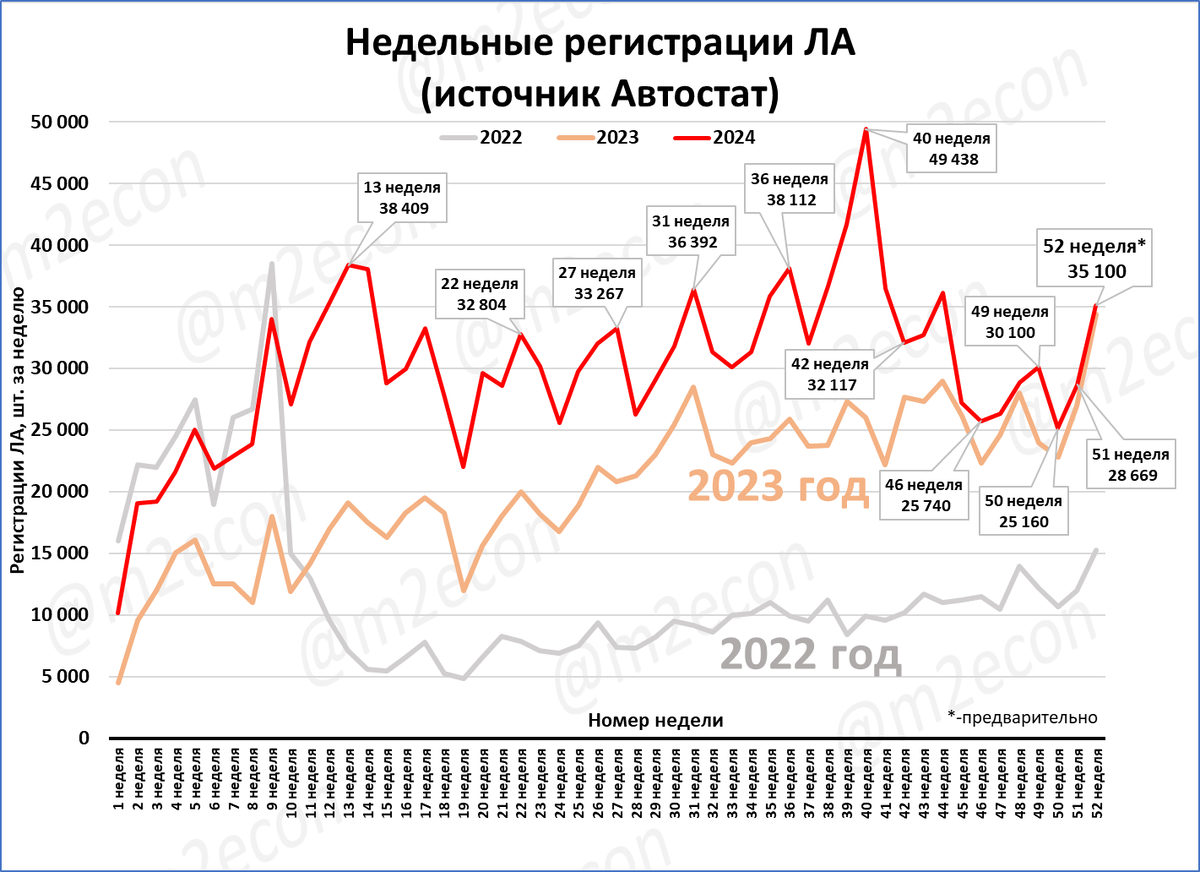 По нашей предварительной оценке, на 52-й неделе было зарегистрировано 35,1 тыс. легковых автомобилей.