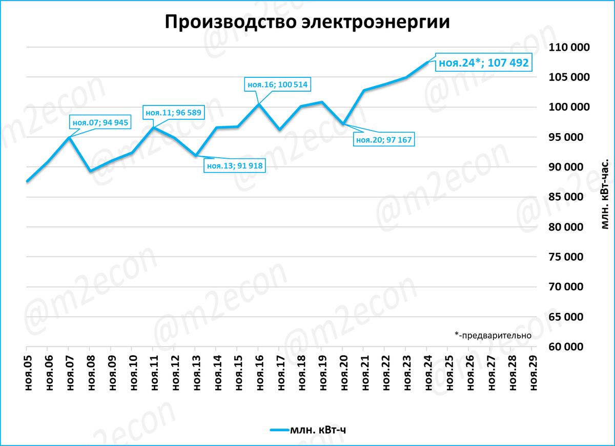 Производство электроэнергии в ноябре составило по нашим предварительным оценкам 107,5 млрд. кВт-часов.