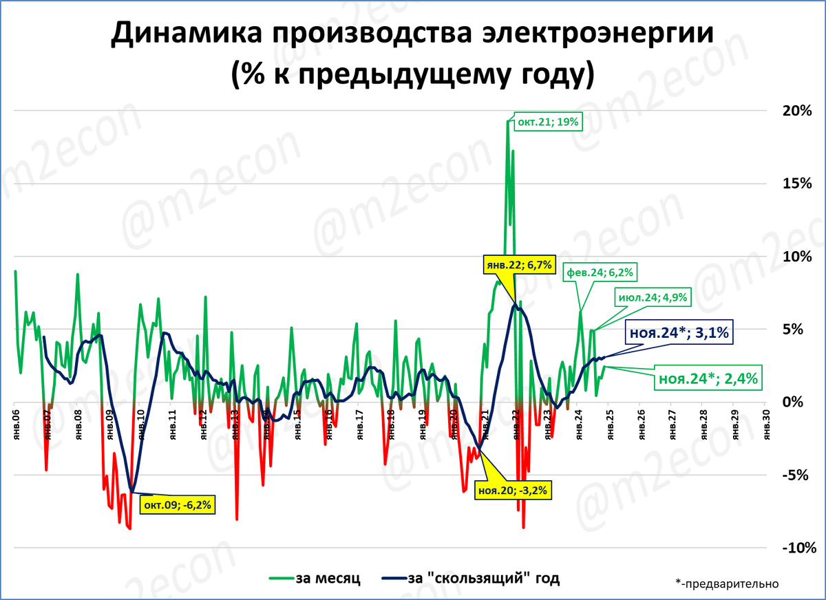 Производство электроэнергии в ноябре выросло на 2,4%. Объём производства за 12-месяцев (скользящий год) установил очередной исторический рекорд. Рекордным будет и итог 2024 года.