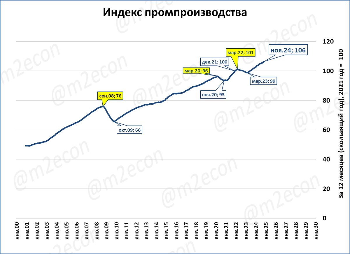 Промпроизводство (это около 30% ВВП) в ноябре выросло на 3,7%. Промпроизводство за последние 12 месяцев (скользящий год) установило новый исторический рекорд.