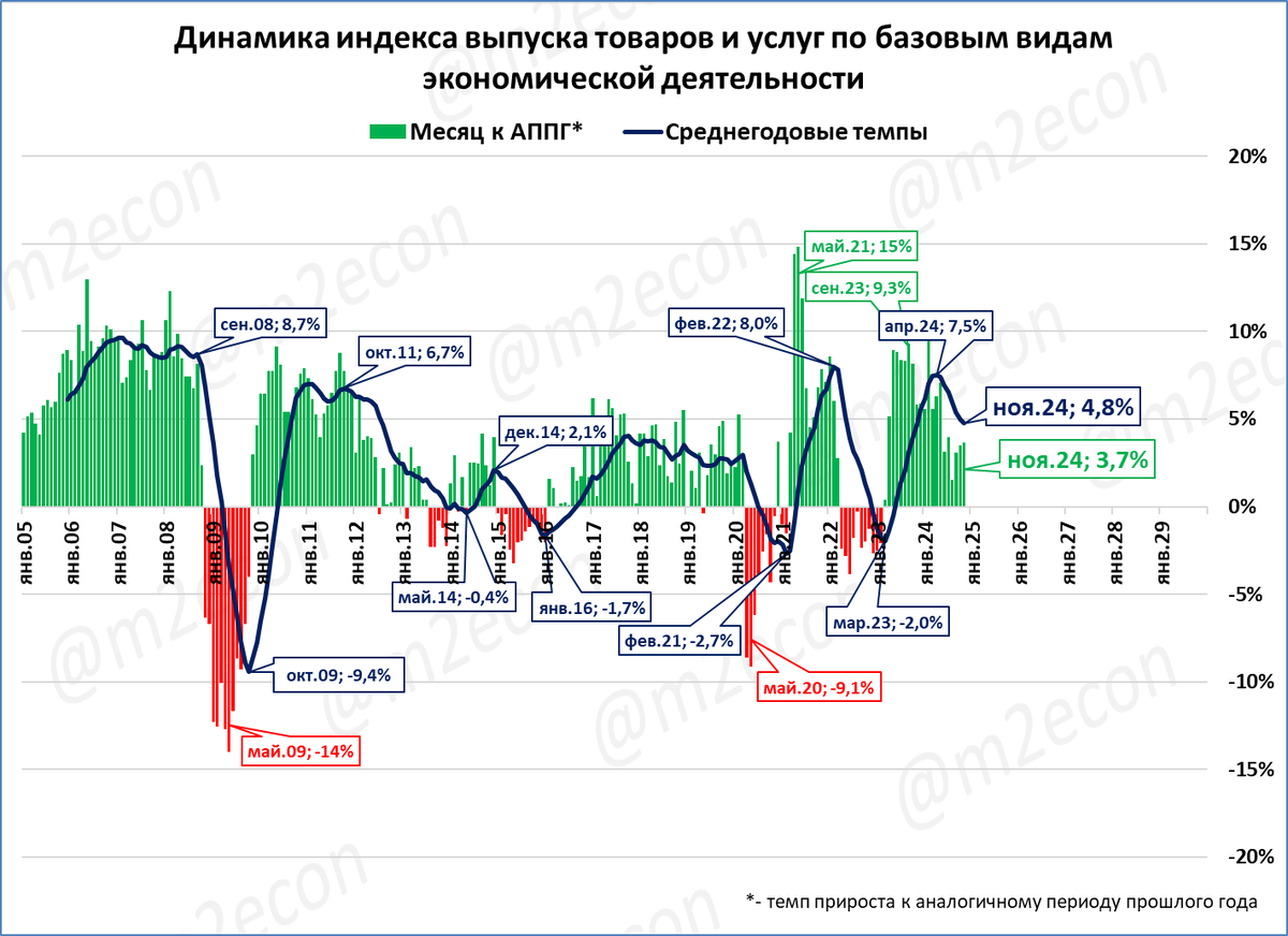 Выпуск базовых отраслей (ВБО; это около 60% ВВП; кроме промпроизводства включает в себя с/хозяйство, строительство, транспорт и торговлю) в ноябре вырос на 3,7% к ноябрю прошлого года.
