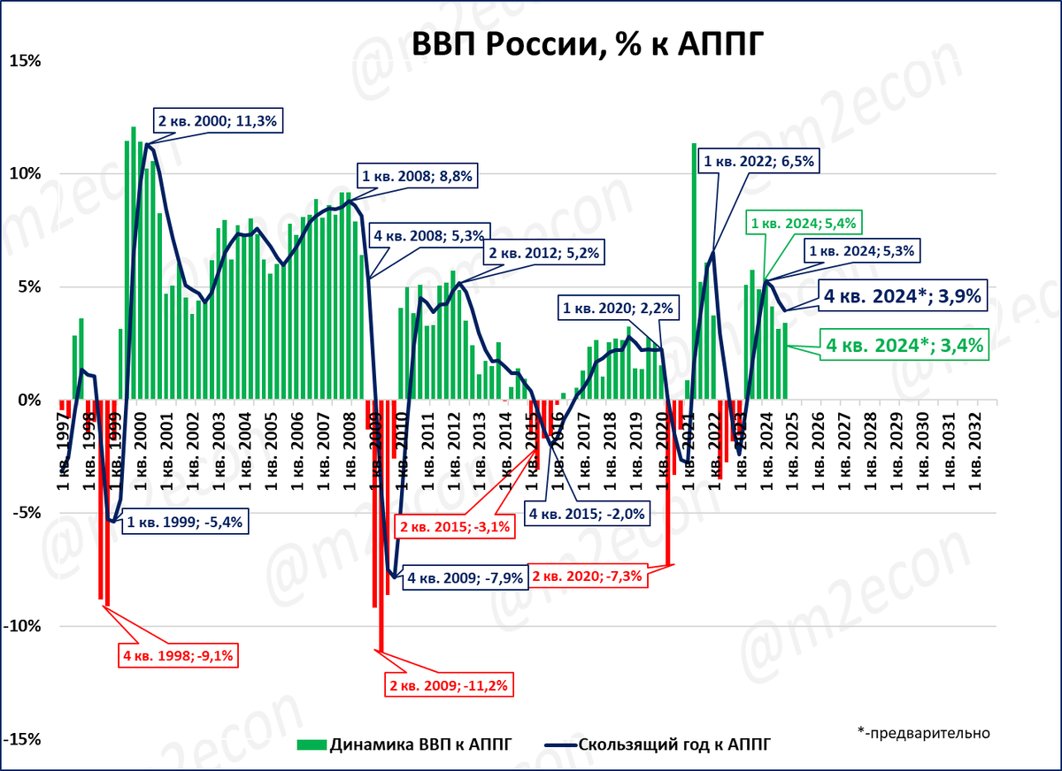 С момента назначения Эльвиры Набиуллиной в ЦБ (2013) это третий год (из двенадцати), когда ВВП растёт более чем на 3%. Все остальные девять лет рост не достигал отметки в 3%.