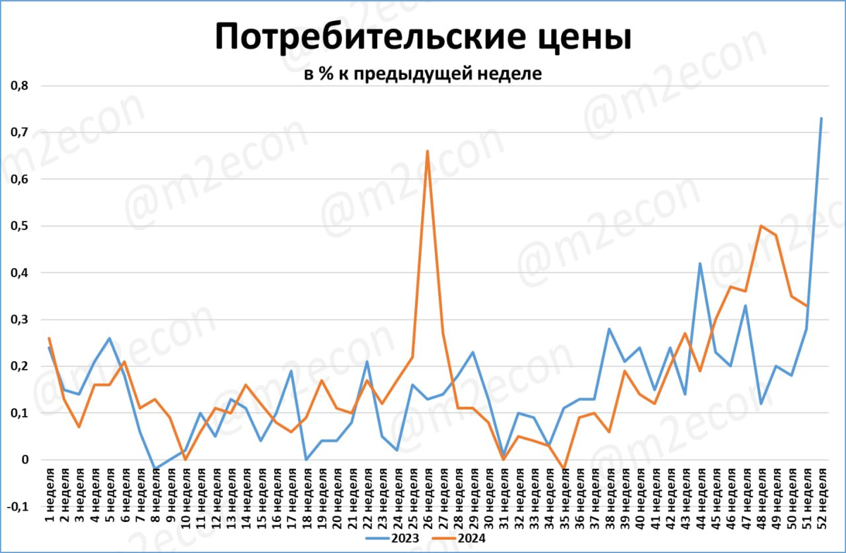 Рост цен за 51-ю неделю (0,33%) был выше, чем за 51-ю неделю прошлого года (0,28%).