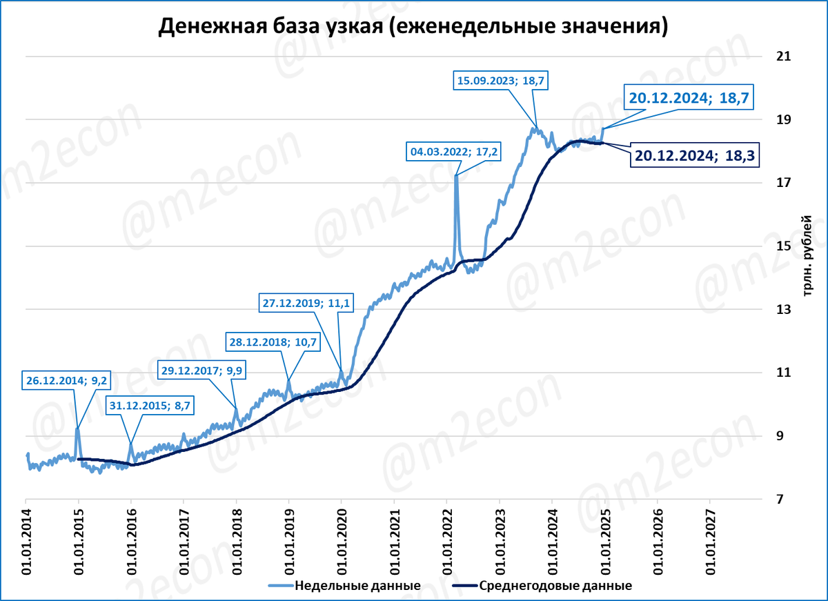 Узкая денежная база (УДБ) уже больше года колеблется в диапазоне 18-19 трлн рублей и не растёт.