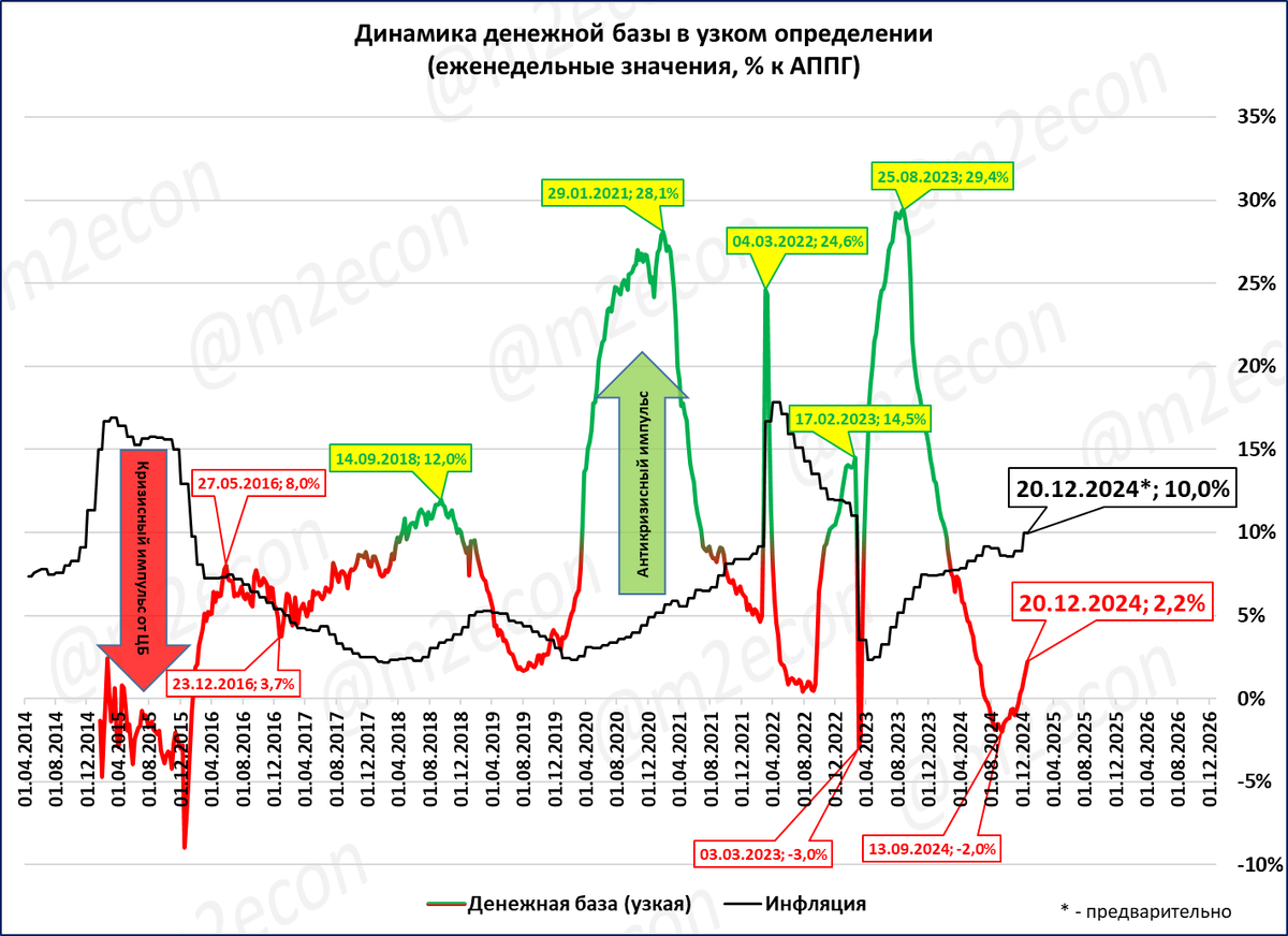 С учётом инфляции, которая составляет 10%, в реальном выражении узкая денежная база сжимается.