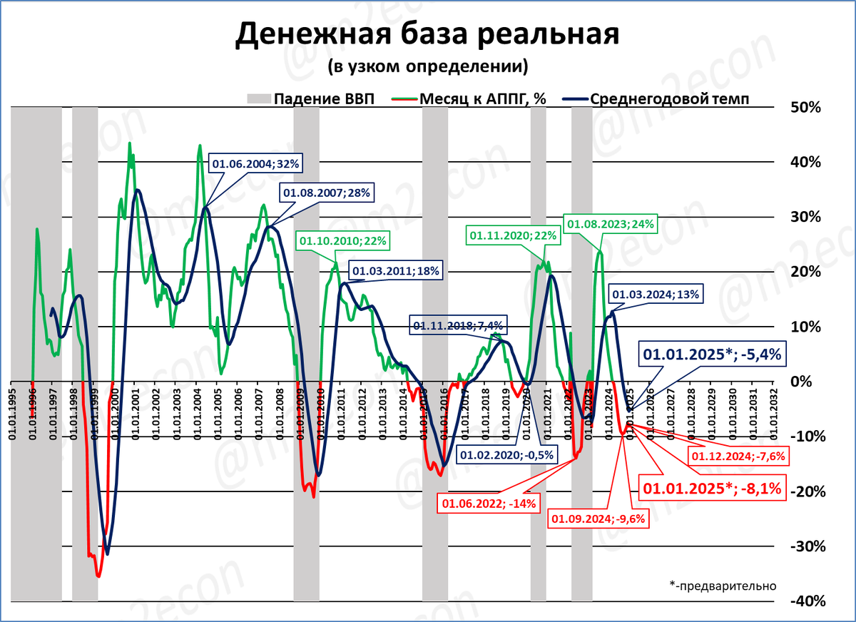 Узкая денежная база в реальном выражении падает, -8,1% годовых.