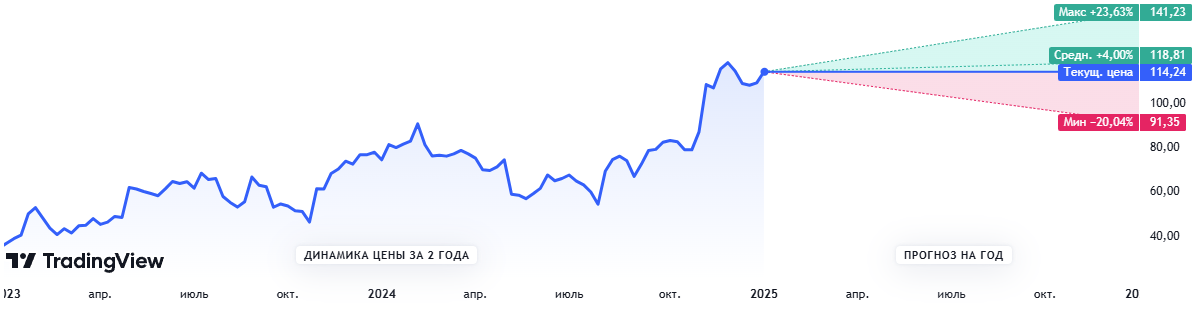 Аналитики Уолл-стрит прогнозируют, что течении года акции компании на максимуме могут вырасти до $141 за бумагу (+2700 пунктов) или ≈23,6%.