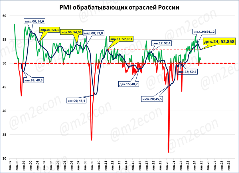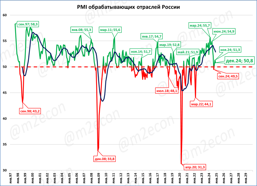 В декабре индекс PMI оставался выше 50 пунктов (50,8), что означает рост деловой активности в обрабатывающей промышленности.
