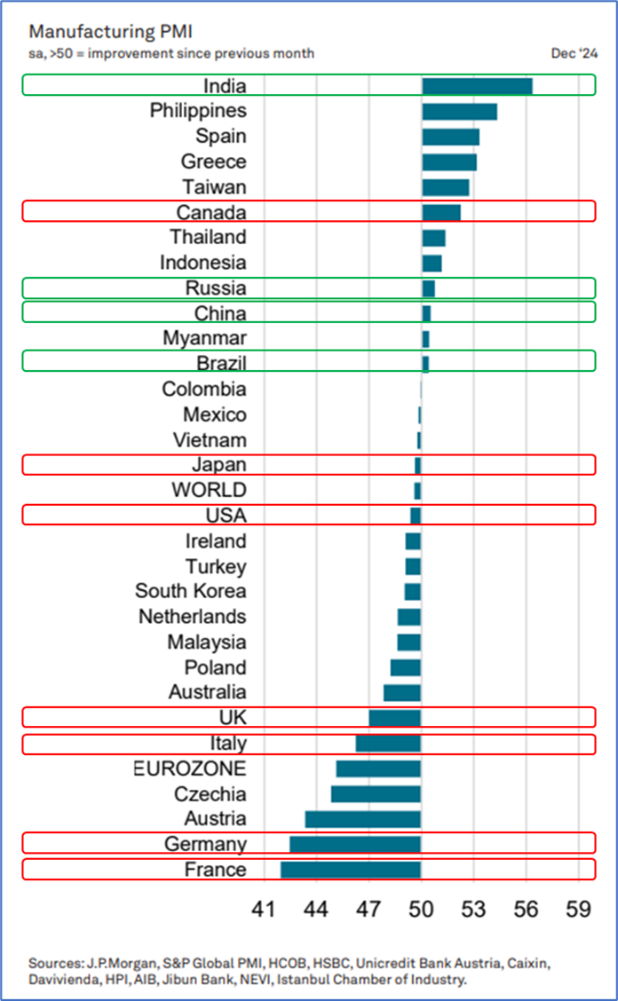 Сравним индексы PMI в производственном секторе между странами БРИК (Бразилия, Россия, Индия, Китай) и странами "Большой семерки" (G7, представляющими коллективный Запад).