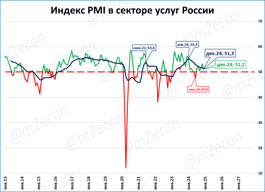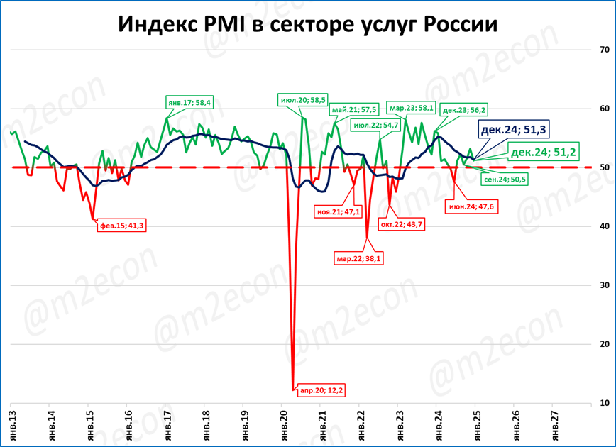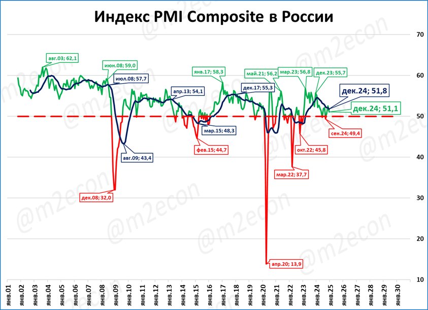 Композитный индекс PMI (промышленность + услуги) в декабре составил 51,1 пункта. Это говорит о росте деловой активности в экономике России в целом.