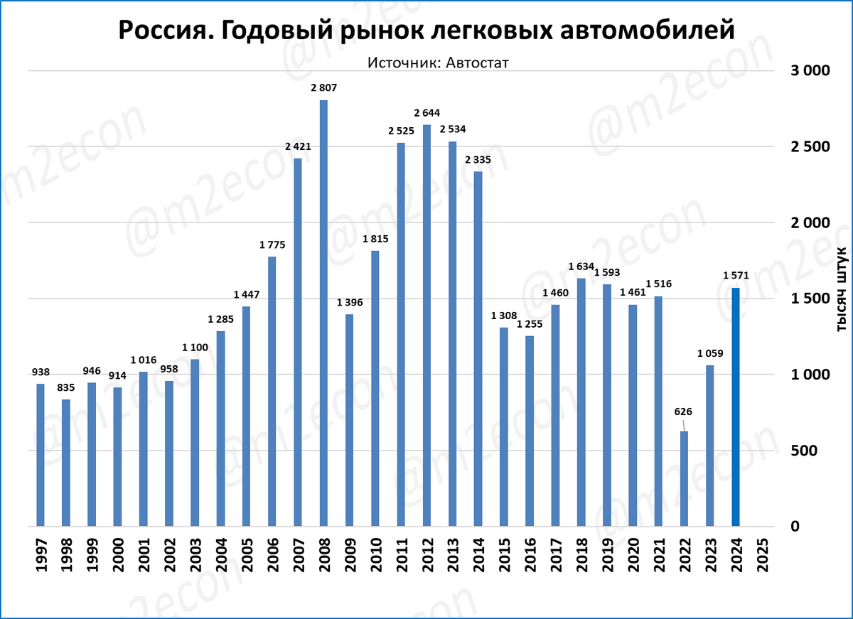 За последние 12 месяцев (это же и итоги 2024 года) было зарегистрировано 1,571 миллиона легковых автомобилей.