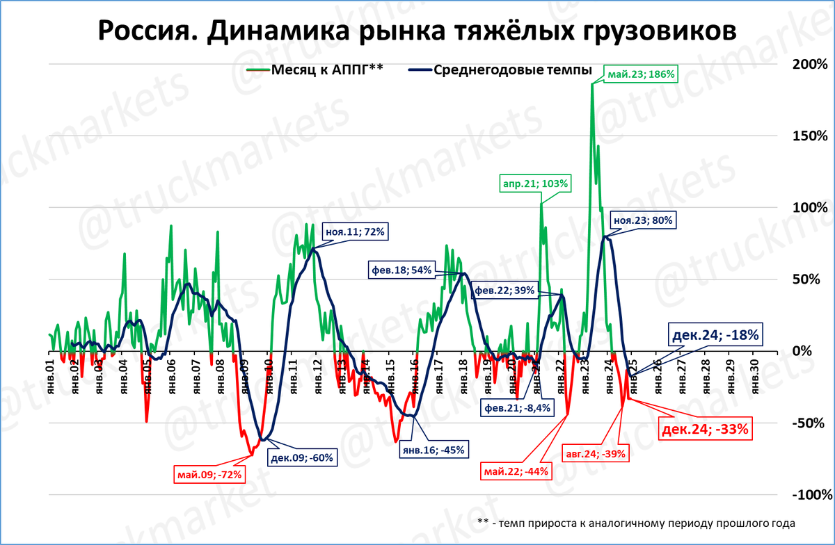 В 2025 году рынок грузовиков продолжит падать. Основная причина – замедление темпов роста ВВП. Для падения рынка грузовиков совсем не обязательно, чтобы ВВП падал, достаточно замедления темпов роста.