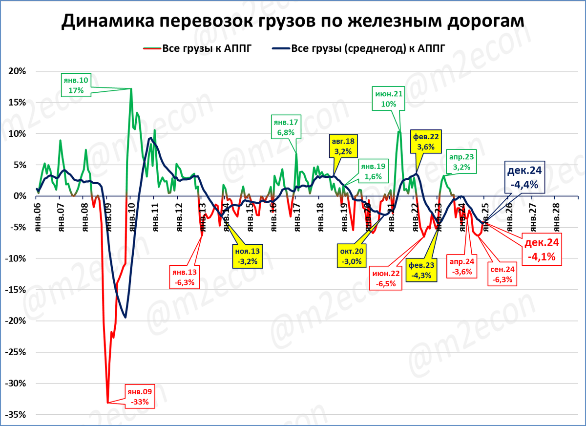 По сути, это итоги 2024 года. Объём перевозок снизился до уровня середины 2010 года, когда Россия только выходила из кризиса 2009 года.