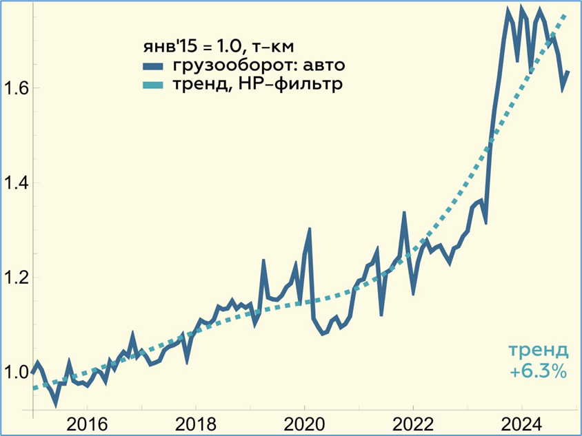 Как минимум, частично падение перевозок по железным дорогам (с 1,3 до 1,2 млрд. тонн в 2019 и 2024 годах, соответственно) компенсируется ростом автомобильных грузоперевозок.