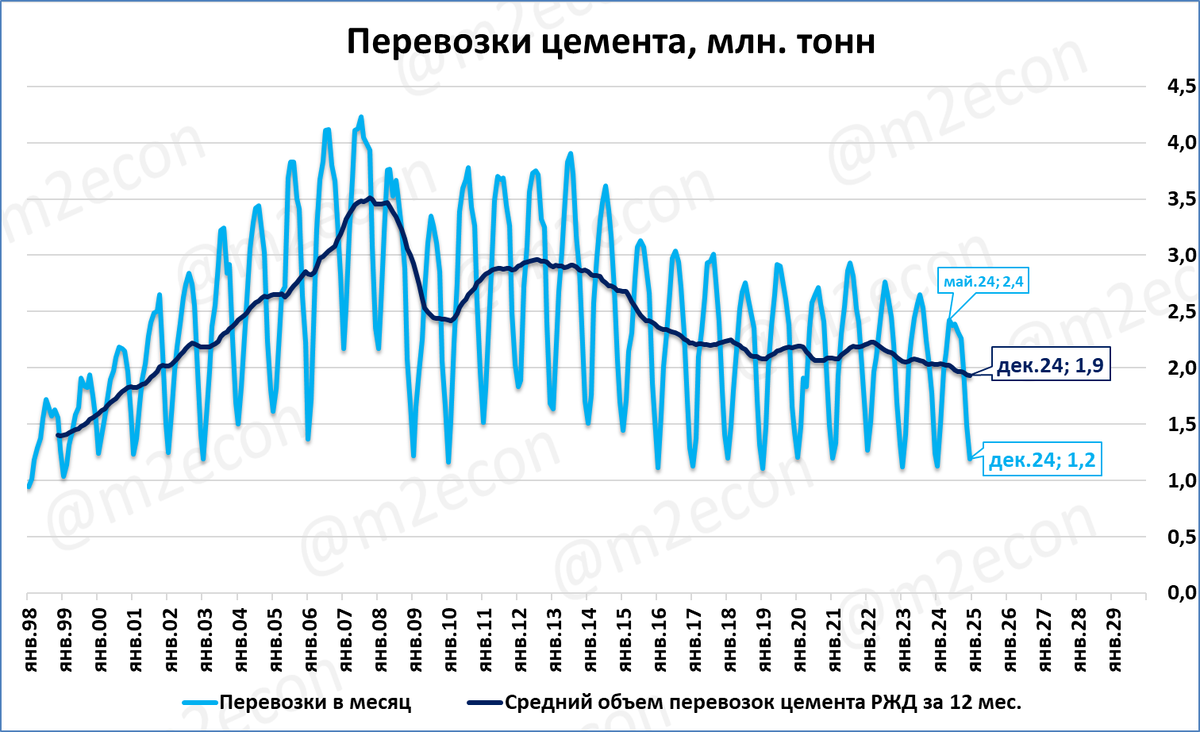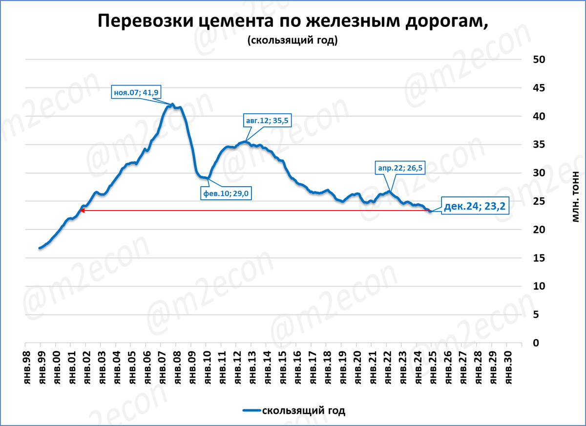 Таким образом, перевозки цемента стабилизировались на уровне 23-летней давности (2001 года).