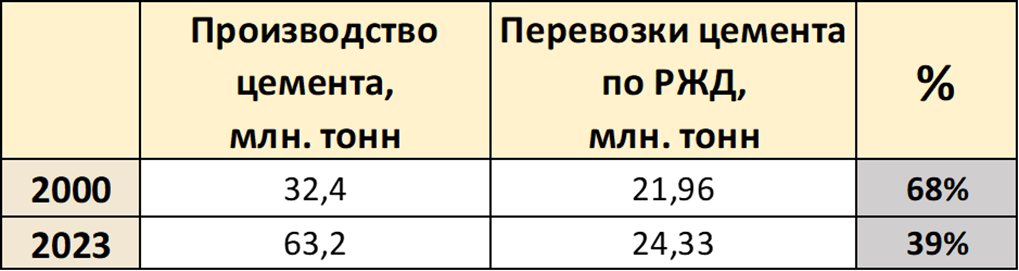 Если в 2000 году львиная доля цемента перевозилась по железным дорогам (68%), то по итогам 2023 года эта доля опустилась ниже 40%.