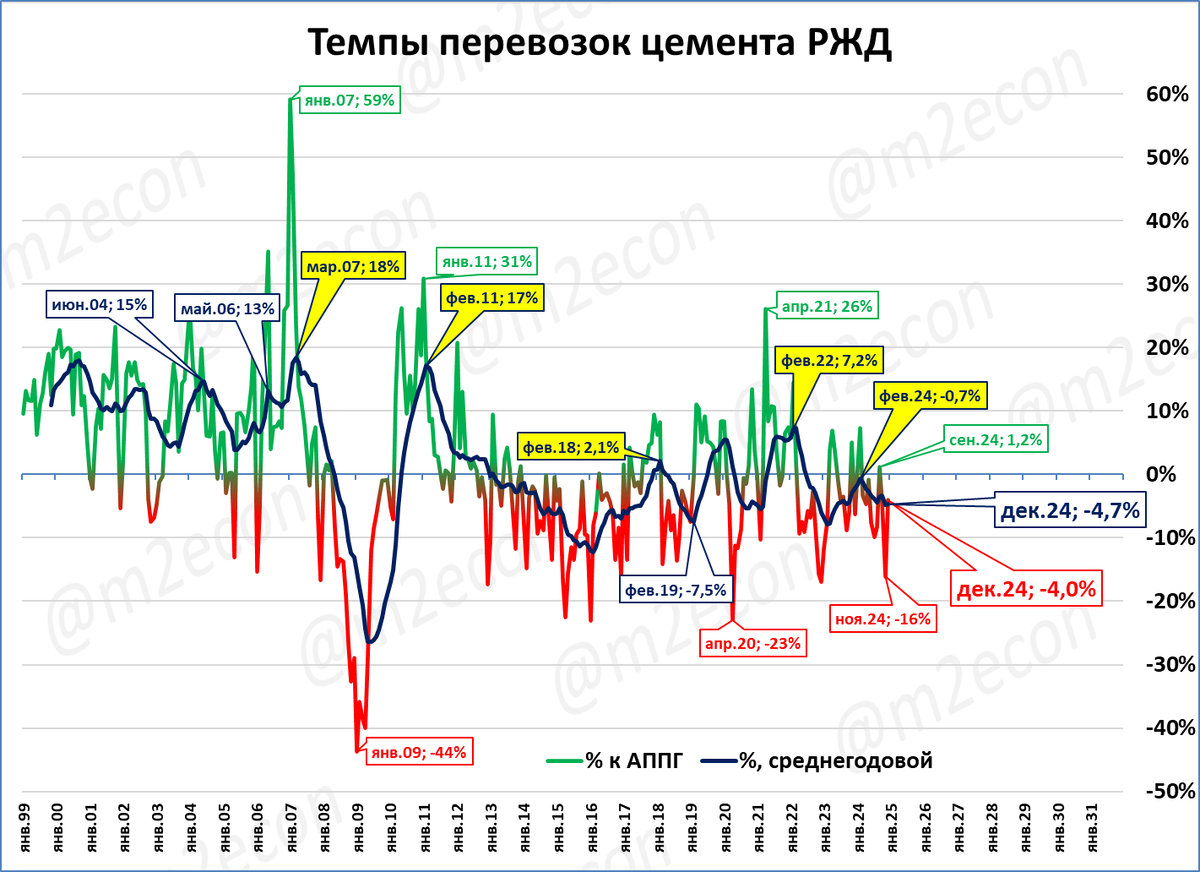 Перевозки цемента по железным дорогам в декабре на 4% ниже, чем в декабре прошлого года. Падение продолжается.