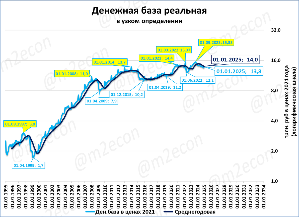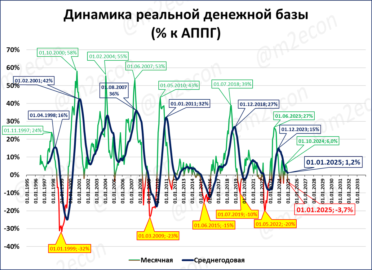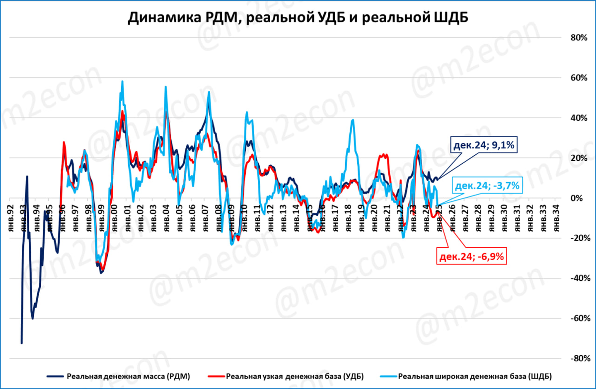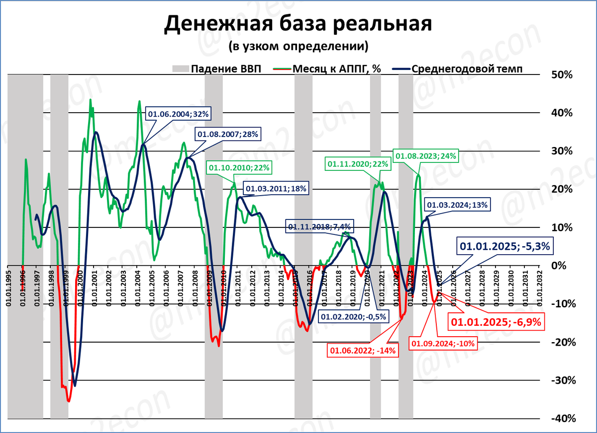Конкретно на 1 января 2025 года реальная денежная база падает. Сейчас она на 3,7% ниже, чем год назад