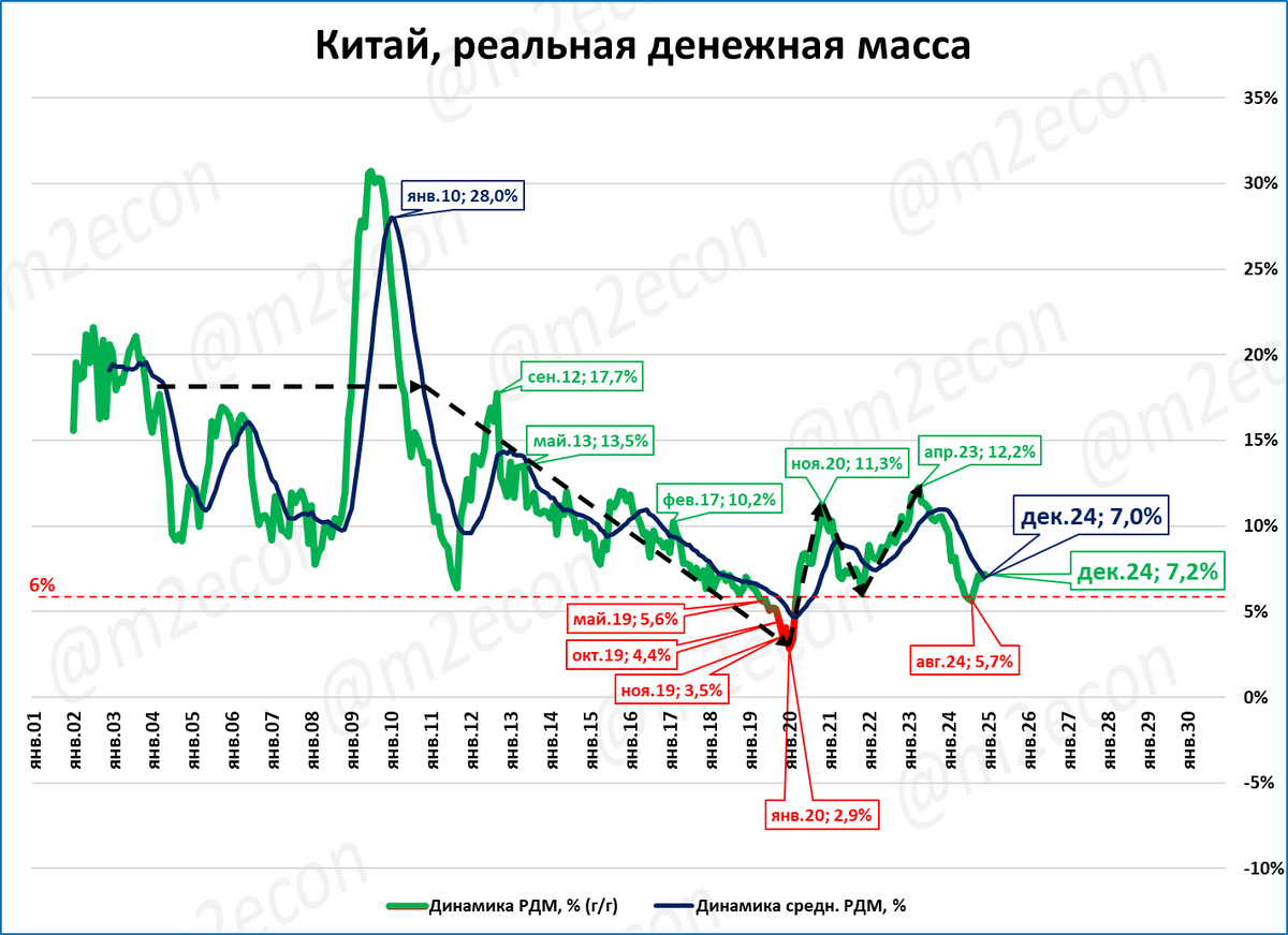 За 2024 год денежная масса в Китае выросла на 7,3%. Цены за это же время практически не выросли (0,1% за год). Ставка 3,1%.