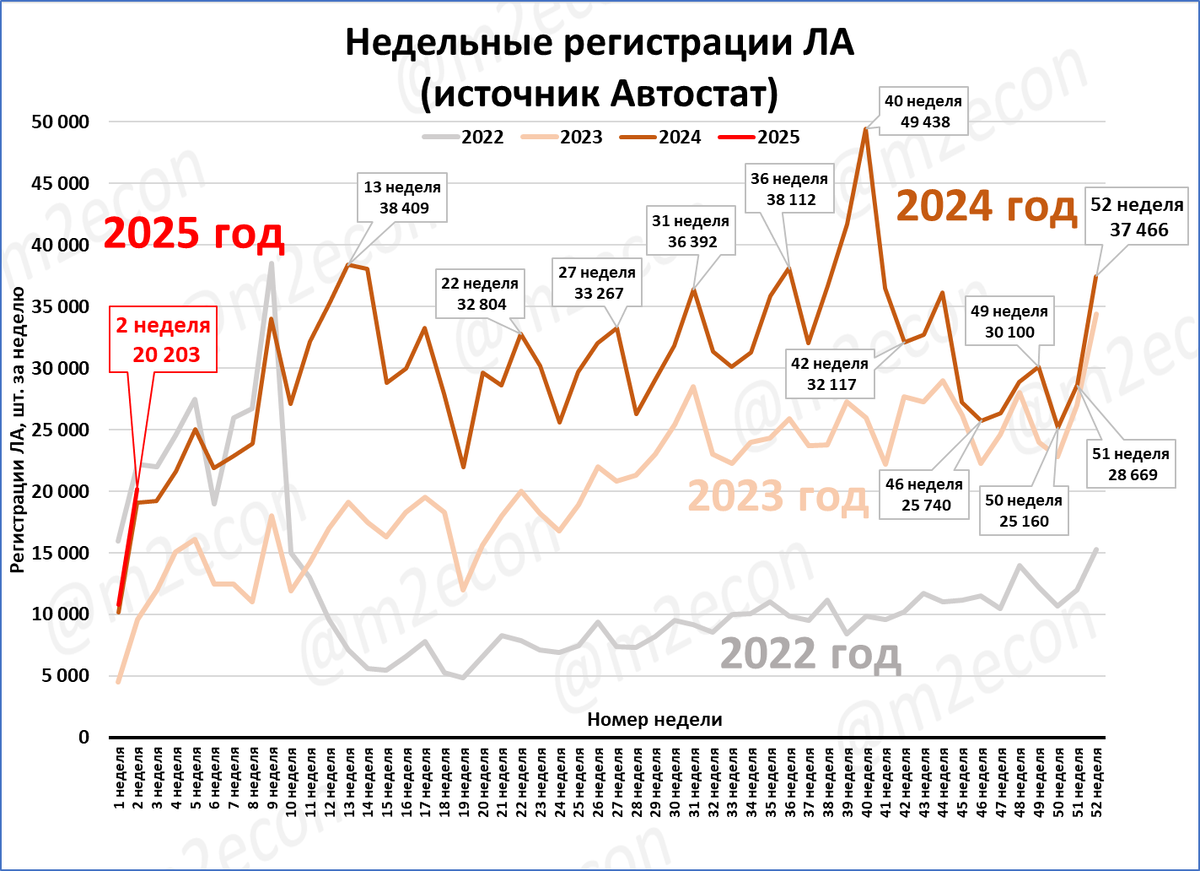 За первые две недели 2025 года было зарегистрировано 31 005 штук легковых автомобилей, а за первые две недели прошлого года было зарегистрировано 29 250 штук.