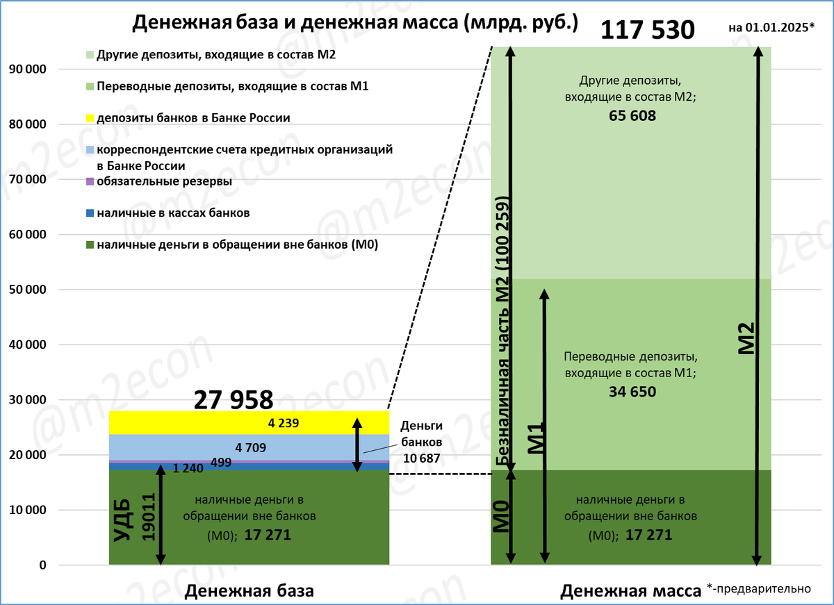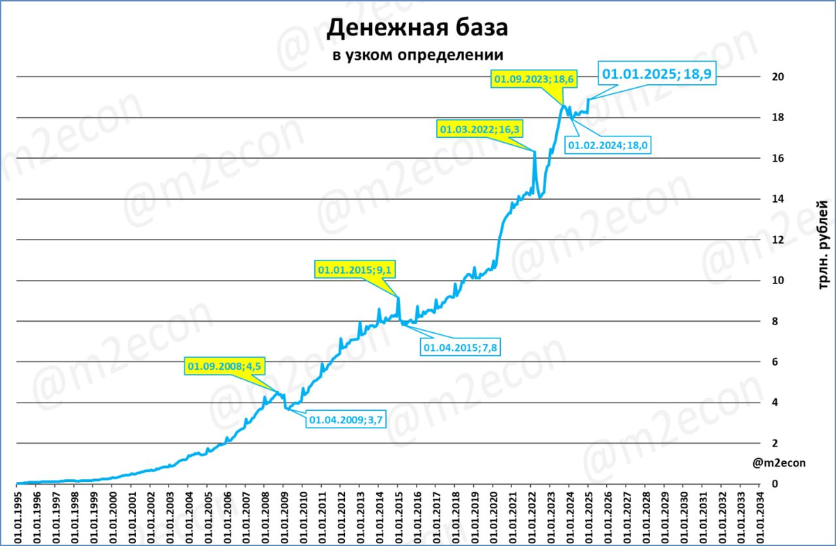 Узкая денежная база (УДБ) по итогам 2024 года, =по состоянию на 1 января 2025 года, установила исторический рекорд: 18,9 трлн рублей