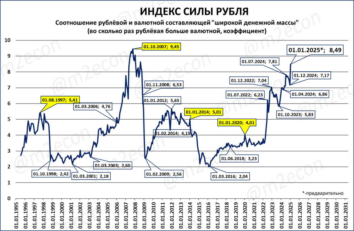 Каковы факты? Сейчас рублёвая денежная масса в 8,5 раз превышает валютную (в составе агрегата М2Х). Это соотношение, которое мы называем «индексом силы рубля» показано на графике ниже.