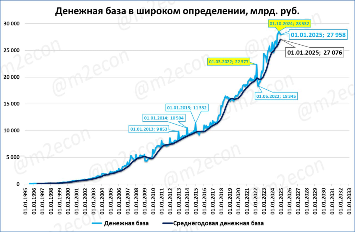 На 1 января 2025 года широкая денежная база составила 27,96 трлн рублей. Это ниже исторического рекорда, установленного три месяца назад (жёлтая выноска на графике). Можно также отметить, что отсутствует традиционный для итогов года пик. Такой пик хорошо виден 1 января 2012, 2013 и 2014 годов.