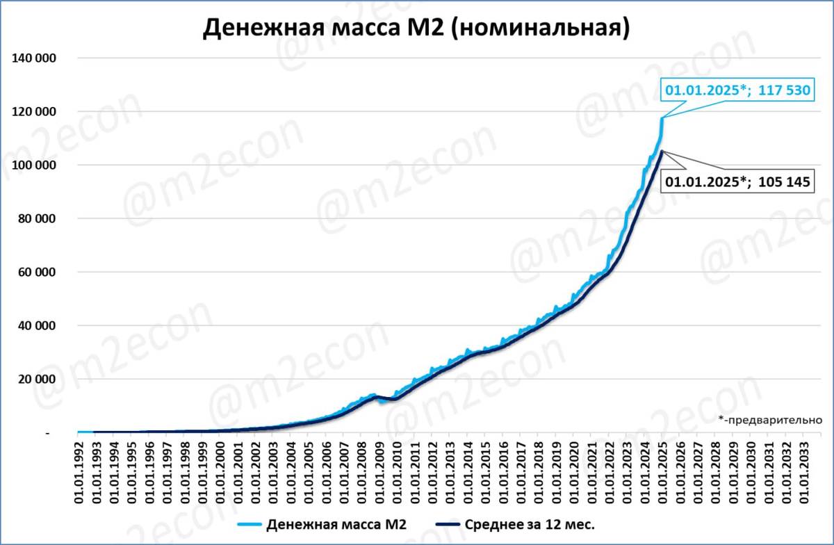 Денежная масса на 1 января 2025 года выросла до 117,5 трлн руб. и установила рекорд.