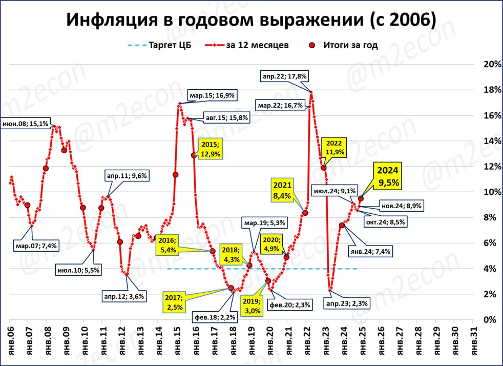Итак, по итогам 2024 года инфляция (9,52%) оказалась чуть ниже, чем мы ожидали по недельным данным (9,97%, см. таблицу).