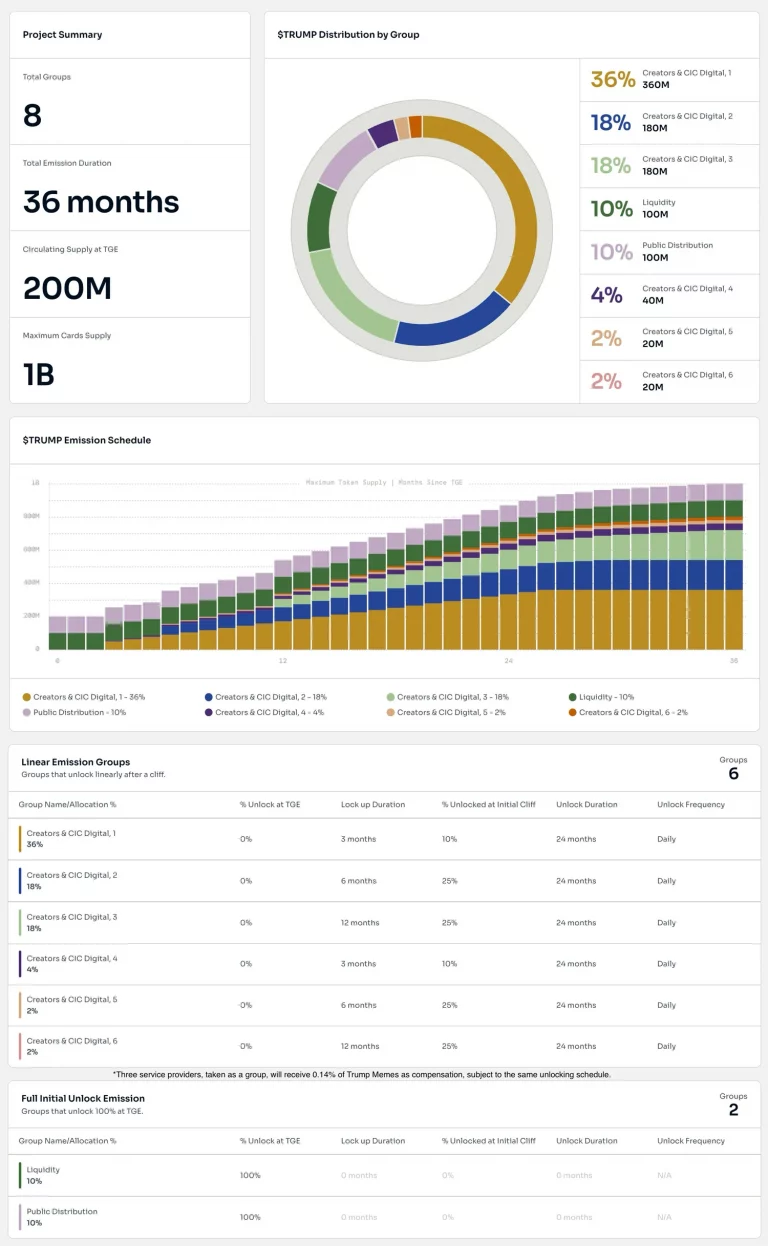 Доступное предложение в день запуска составило 200 млн TRUMP при общей эмиссии в 1 млрд монет. Согласно сайту проекта, токены планируется разблокировать постепенно в течение трех лет.