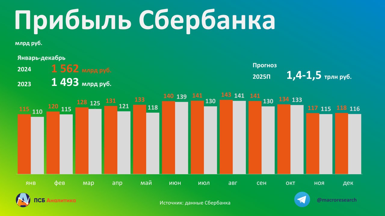 В декабре 2024 г. Сбербанк заработал 118 млрд руб. (+1,8% г/г), а за 12 месяцев - 1,56 трлн руб. (+4,6% г/г). Такие доходы предполагают дивиденды по итогам года на уровне 34,7-35,2 руб. на акцию, что даёт дивидендную доходность в 12,3-12,5%.
