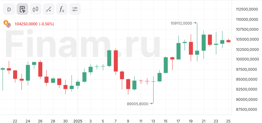 Биткоин не остался в стороне роста акций США и также зафиксировал новые максимумы на этой неделе. Тем не менее, торги самой популярной криптовалютой выдались волатильными. В моменте стоимость биткоина росла выше $109 000, однако после инаугурационной речи Трампа падала к $100 000. Причинами падения криптосообщество называло отсутствие в речи Трампа заявлений относительно этого сектора. Рынок ожидал, что президент США публично объявит криптовалюту в качестве приоритета американской экономики.