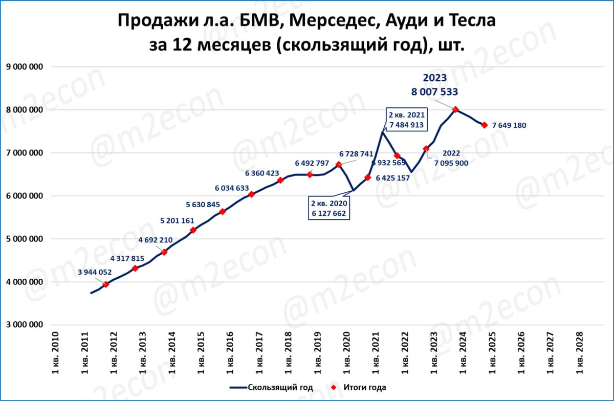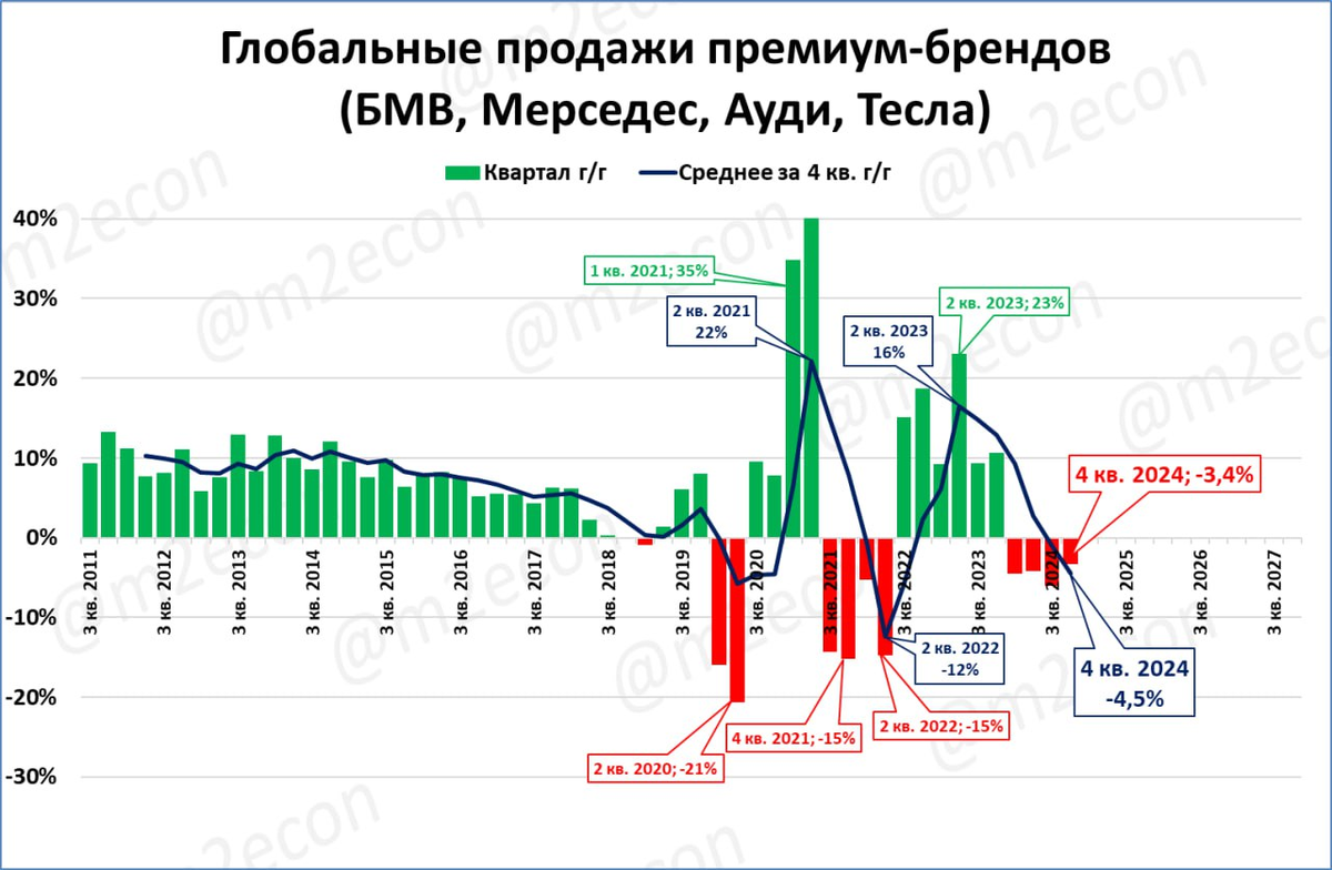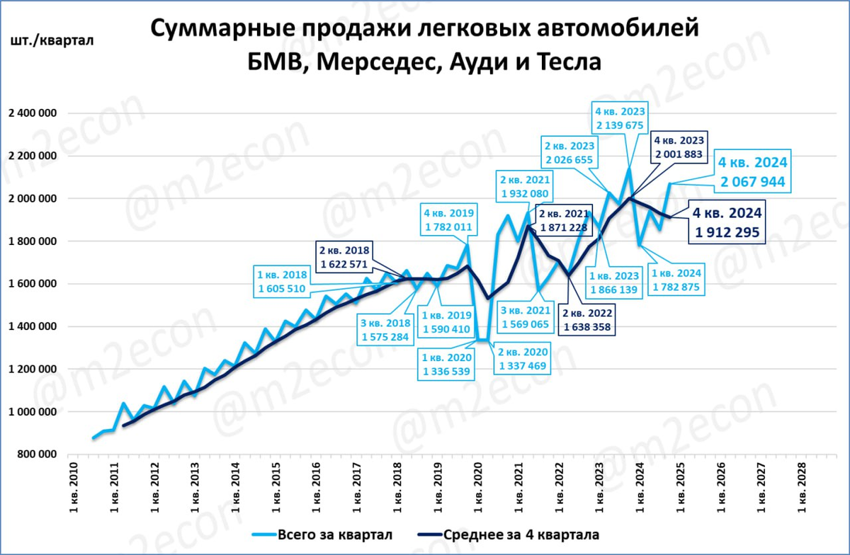 Премиум-автомобили: глобальные (=по всему миру) продажи четырёх брендов (Ауди, БМВ, Мерседес и Тесла) в четвёртом квартале составили 2,1 млн. шт. (-3,4%). Продажи падают четвёртый квартал подряд. При этом 2024 год стал вторым лучшим в истории. А выглядит падающим он только на фоне рекордного 2023 года.