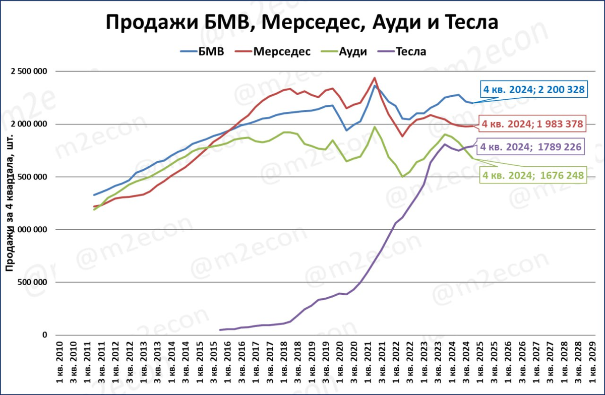 Глобальные (по всему миру) продажи премиум-автомобилей порой являются неплохим опережающим индикатором мировой экономики. Раз в квартал мы пишем о продажах трёх немецких марок — Ауди, БМВ и Мерседес, — и марки Тесла.