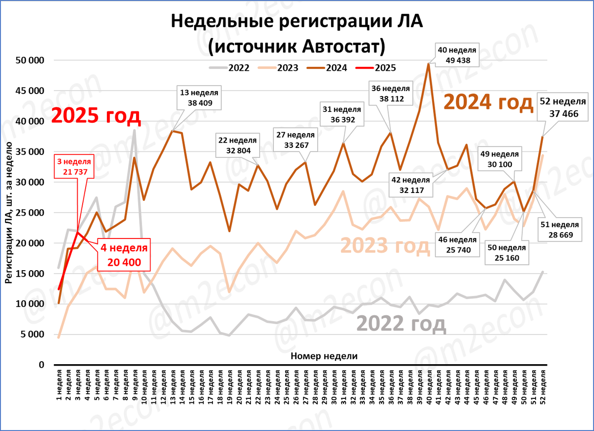 За 4 неделю 2025 года по данным Автостата было зарегистрировано 20,4 штук легковых автомобилей (-6% к 4 неделе прошлого года).