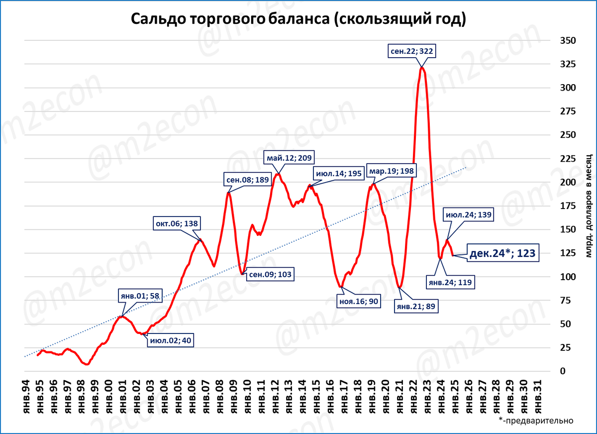 Сальдо за 12 месяцев (скользящий год) составило 123 млрд. долларов.