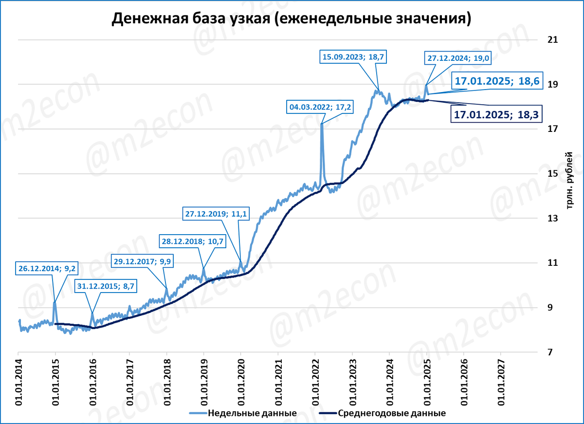 Узкая денежная база (УДБ) уже больше года колеблется в диапазоне 18-19 трлн рублей и не растёт.