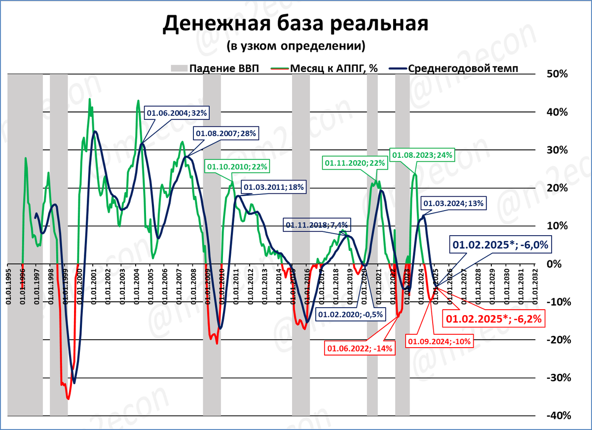 Сейчас реальная УДБ (падает) и РДМ (растёт) показывают противоположную динамику. Именно этим и объясняется отсутствие провала в ВВП на фоне сжатия реальной узкой денежной базы на этот раз.