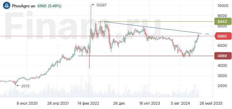 Исторически акции «ФосАгро», как правило, после значительного роста проходят через длительный, до нескольких лет, период консолидации в широком боковом коридоре, после чего, накопив потенциал, снова «выстреливают». Так, например, перед последним взлетом в 2021–2022 гг. до 8 000–9 000 руб. они в течение целых 5 лет (с 2015 до 2020 г.) колебались в торговом диапазоне 1 800–3 000 руб. Похожая картина наблюдалась и ранее. И теперь до выхода на новые уровни может пройти еще несколько лет.