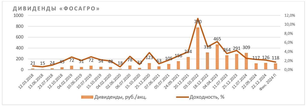 «ФосАгро» придерживается квартального распределения дивидендов, но выплаты могут происходить нерегулярно. Так, в июле 2024 г. акционеры получили по 309 руб. на акцию, в том числе по 294 руб. за 4К 2023 (финальные дивиденды 2024 г.) и по 15 руб. за 1К 2024. Всего в течение 2024 г. акционеры получили дивидендов в сумме по 717 руб. на акцию, доходность к цене акций «ФосАгро» на начало 2024 г. составила 11,2%.