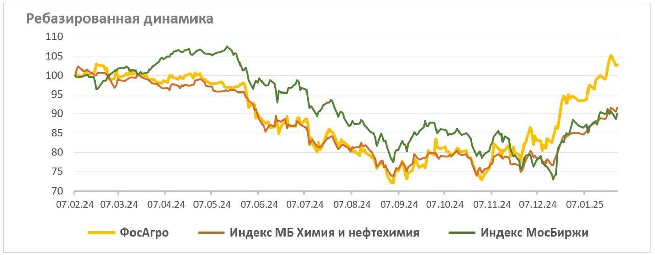 Весной прошлого года акции «ФосАгро» отставали от рынка, затем двигались параллельно, а с декабря заметно опережают его. За полный календарный год акции «ФосАгро» показывают рост на 2,6%, в то время как отраслевой индекс потерял 8,4%, а индекс МосБиржи находится в минусе 10,0% (по данным на 28.01.2025 г.).
